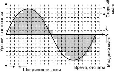 Квантование - процесс замены реальных значений сигнала приближенными с определенной точностью (рис. 2). Таким образом, оцифровка – это фиксация амплитуды сигнала через определенные промежутки времени и регистрация полученных значений амплитуды в виде округленных цифровых значений (так как значения амплитуды являются величиной непрерывной, нет возможности конечным числом записать точное значение амплитуды сигнала, именно поэтому прибегают к округлению). Записанные значения амплитуды сигнала называются отсчетами. Очевидно, что чем чаще мы будем делать замеры амплитуды (чем выше частота дискретизации) и чем меньше мы будем округлять полученные значения (чем больше уровней квантования), тем более точное представление сигнала в цифровой форме мы получим.