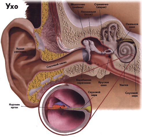 Снаружи мы видим так называемое внешнее ухо. Ничего особенного нас тут не интересует. Затем идет канал - примерно 0.5 см в диаметре и около 3 см в длину. Далее - барабанная перепонка, к которой присоединены кости - среднее ухо. Эти косточки передают вибрацию барабанной перепонки далее - на другую перепонку, во внутреннее ухо - трубку с жидкостью, около 0.2 мм диаметром и еще целых 3-4 см длинной, закрученная как улитка. Смысл наличия среднего уха в том, что колебания воздуха слишком слабы, чтобы напрямую колебать жидкость, и среднее ухо вместе с барабанной перепонкой и перепонкой внутреннего уха составляют гидравлический усилитель - площадь барабанной перепонки во много раз больше перепонки внутреннего уха, поэтому давление (которое равно F/S) усиливается в десятки раз.