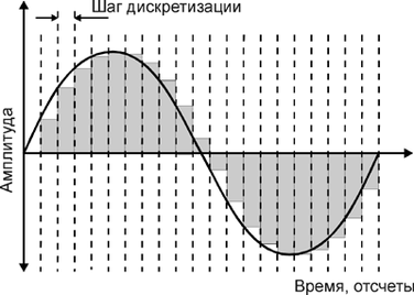 Цифровой звук – это способ представления электрического сигнала посредством дискретных численных значений его амплитуды. Допустим, мы имеем аналоговую звуковую дорожку хорошего качества (говоря «хорошее качество» будем предполагать нешумную запись, содержащую спектральные составляющие из всего слышимого диапазона частот – приблизительно от 20 Гц до 20 КГц) и хотим «ввести» ее в компьютер (то есть оцифровать) без потери качества. Как этого добиться и как происходит оцифровка? Звуковая волна – это некая сложная функция, зависимость амплитуды звуковой волны от времени. Казалось бы, что раз это функция, то можно записать ее в компьютер «как есть», то есть описать математический вид функции и сохранить в памяти компьютера. Однако практически это невозможно, поскольку звуковые колебания нельзя представить аналитической формулой (как y=COSx, например). Остается один путь – описать функцию путем хранения ее дискретных значений в определенных точках. Иными словами, в каждой точке времени можно измерить значение амплитуды сигнала и записать в виде чисел. Однако и в этом методе есть свои недостатки, так как значения амплитуды сигнала мы не можем записывать с бесконечной точностью, и вынуждены их округлять. Говоря иначе, мы будем приближать эту функцию по двум координатным осям – амплитудной и временной (приближать в точках – значит, говоря простым языком, брать значения функции в точках и записывать их с конечной точностью). Таким образом, оцифровка сигнала включает в себя два процесса - процесс дискретизации (осуществление выборки) и процесс квантования. Процесс дискретизации - это процесс получения значений величин преобразуемого сигнала в определенные промежутки времени (рис. 1).