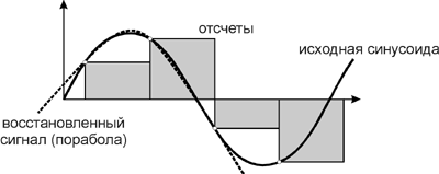 Для преобразования дискретизованного сигнала в аналоговый вид, пригодный для обработки аналоговыми устройствами (усилителями и фильтрами) и последующего воспроизведения через акустические системы, служит цифроаналоговый преобразователь (ЦАП). Процесс преобразования представляет собой обратный процесс дискретизации: имея информацию о величине отсчетов (амплитуды сигнала) и беря определенное количество отсчетов в единицу времени, путем интерполирования происходит восстановление исходного сигнала (рис. 3).