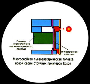 В основе пьезоэлектрической технологии лежит способность пьезоэлемента деформироваться под воздействием электрического поля. В каждое сопло печатающей головки встроена плоская мембрана, изготовленная из пьезокристалла. Под воздействием электрического импульса мембрана деформируется, а создаваемое при этом давление выбрасывает из сопла микроскопическую каплю чернил.