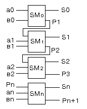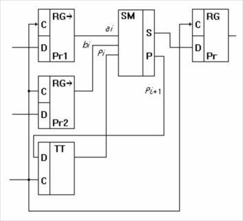 Последовательный сумматор осуществляет суммирование слагаемых и цифр переноса поразрядно, начиная с младшего разряда. Основой его схемы является одноразрядный сумматор. Суммирование производится в одноразрядном сумматоре SM. Цифры i-того разряда слагаемого и цифра переноса из младшего разряда передаются на вход сумматора одновременно с приходом тактового импульса. Регистры 1 и 2 используются для приема и хранения цифр i-того разряда слагаемых. В D - триггере хранится цифра переноса из младшего разряда. Регистр 3 принимает и хранит цифру i-того суммы. С приходом тактового импульса из регистров 1, 2 и D - триггера разряда слагаемых и цифра переноса поступает на вход одноразрядного сумматора. Одновременно регистр 3 освобождается для приема цифры суммы.