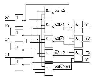 Схема устроена так, что управляющий. сигнал = 1 гасит соответствующий элемент Z (Zn соотв Yn). Преобразователь работает в соответствии с таблицей: