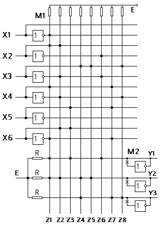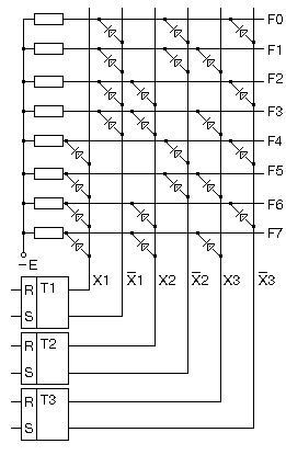 В этой схеме используется отрицательная логика. При подаче "1" на анод диода он закрывается. Если закрыты все 3 диода, подсоединенные к одной гориз. линии то на этой линии потенциал -Е, соответствующий уровню "1".