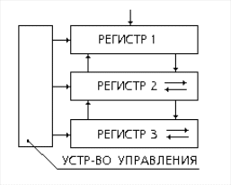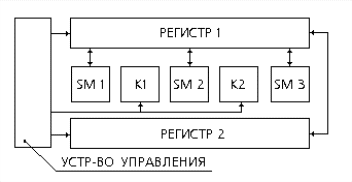 Например, в этой схеме суммирование происходит так: операнды подаются в регистр 1. Регистр 2 является накапливающим сумматором или автоматом с памятью. Он суммирует слагаемые, поступающие в разные моменты времени и передает результат в регистр 3.
