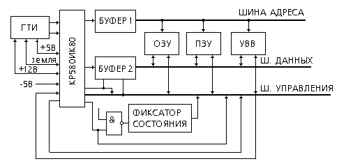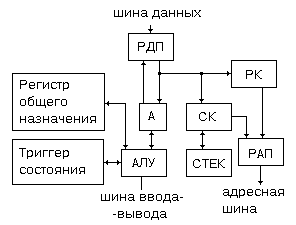 Триггеры состояния сигнализируют о следующих состояниях МП: обнуление аккумулятора, содержимое знакового разряда, переполнение разрядной сетки, цифры переносов из 8-го и 4-го разрядов, содержимое разряда контроля на четность и нечетность. Адресная шина является однонаправленной, а шина данных - двунаправленной. СТЕК - особый вид памяти, расширяющий функциональные возможности МП. Например при выполнении прерывающей программы в СТЕК помещается номер команды возврата и результат выполнения последней команды перед переходом к выполнению прерывающей программы.