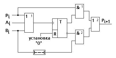 одновременно bi опрокидывает триггер в "0". На инверсном выходе триггера устанавливается "1", следовательно на вторую схему "И" подаются две единицы, следовательно на выходе второй схемы "ИЛИ" формируется цифра переноса в старший разряд, равная "1". Если Pi=0, то цифра суммы, которая снимается с прямого выхода триггера, равна "0". Если Pi=1, то сумма Si=1.