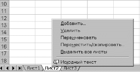 Новый лист всегда вставляется перед активным рабочим листом. Пользователь может щелкнуть по названию рабочего листа правой кнопкой мыши, после чего откроется контекстное (зависящее от ситуации) меню, в котором также имеется директива добавления. Если нужно удалить рабочий лист, нужно открыть щелчком правой кнопки мыши контекстное меню и выполнить директиву удаления.