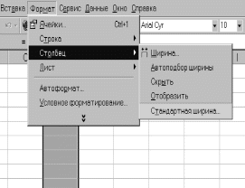 Коррекция высоты строк и ширины столбцов. Прежде всего, корректируемая строка или столбец таблицы должны быть промаркированы. Для этого необходимо щелкнуть левой кнопкой мыши по номеру (координате) строки или столбца. В меню Формат находятся подменю Строка и Столбец. При выборе одного из этих подменю открывается меню следующего уровня. В подменю Столбец вызовите директиву Ширина, тогда откроется диалоговое окно, в котором пользователь может указать ширину столбца. В качестве единицы измерения можно использовать один символ. Команда Автоподбор ширины из меню Столбец автоматически корректирует ширину столбца в соответствии с его содержимым.