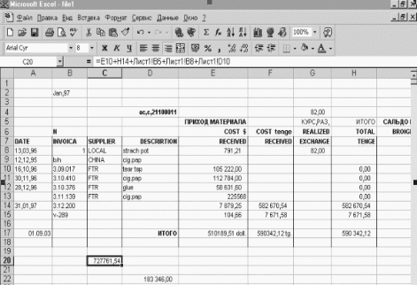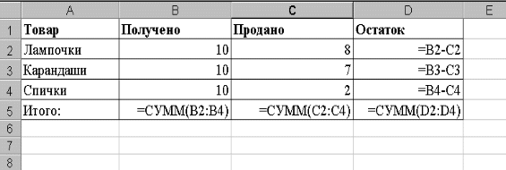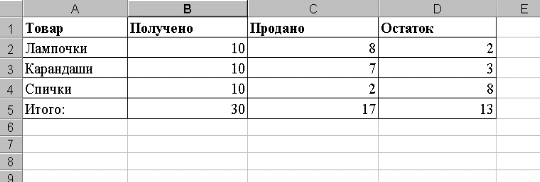 Так будет выглядеть экран по окончанию работы (см. рис. 7). Весь «фокус» заключается в том, что Вы не заполняете те поля, которые можно рассчитать, а вводите только первичную информацию, в данном случае столбцы «Товар», «Получено», и «Продано», а все подсчеты выполняет программа. На самом деле, чтобы Ваша таблица выглядела так как показано выше Вы должны ввести следующее: