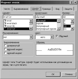 Установка шрифтов. Необходимо промаркировать ячейки, в которых нужно изменить шрифт. После этого можно либо открыть контекстное меню правой кнопкой мыши и вызвать директиву Формат Ячеек. В верхнем поле открывшегося окна Формат Ячеек нужно выбрать опцию Шрифт. В окне появится поле Шрифт, в котором можно выбрать вид шрифта из предлагаемого списка. Содержание этого списка зависит от установок, сделанных в среде Windows (см. рис 6).