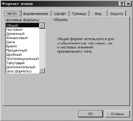 Форматирование чисел. Прежде всего, нужно промаркировать ячейки, в которых надо изменить формат представления чисел. После этого можно либо открыть правой кнопкой мыши контекстное меню и вызвать в нем директиву Формат Ячеек, либо вызвать директиву Ячейка из меню Формат. В любом случае на экране появится диалоговое окно Формат Ячеек. По умолчанию в верхнем поле этого окна будет выбрана опция Число, которая предназначена для форматирования чисел.