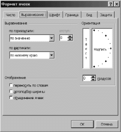 Выравнивание данных. Для выравнивания содержимого ячеек прежде всего надо промаркировать выравниваемые ячейки. Далее следует вызвать диалог, изображенный на рис.5 и в верхнем поле этого окна выбрать закладку Выравнивание.