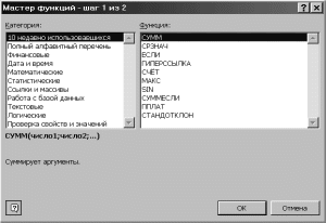 В левом поле этого окна перечислены категории функций, а в правом - функции, соответствующие выбранной категории. Для того чтобы увидеть все функции, следует щелкнуть мышью по опции Все в поле категорий.