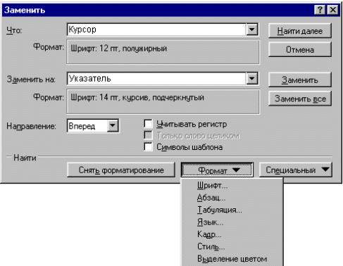 Поиска и замены форматирования и стилей. Например, найти весь подчеркнутый текст и заменить его на курсив, или найти все абзацы с определенным стилем, чтобы применить к ним другой стиль, или изменять фрагмент текста только в тех случаях, когда он встречается в абзаце определенного стиля. При замене формата заменяется каждое его вхождение, например, если заменять шрифт Arial на шрифт Times New Roman, то измениться и полужирный текст с шрифтом Arial на полужирный текст с шрифтом Times New Roman.