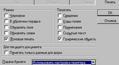 Если диалоговое окно Параметры вызвано не из диалогового окна Печать, то закладка Печать может быть неактивной, в этом случае следует щелкнуть по нужной закладке левой клавишей мыши.