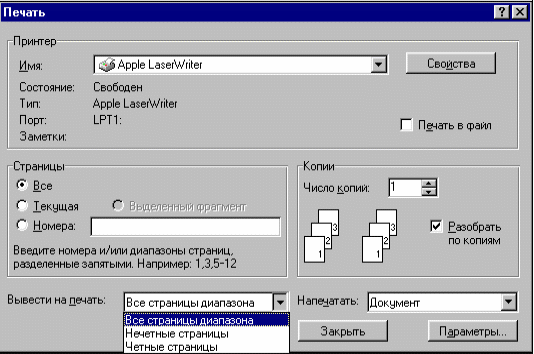 Поле Выдать на печать[5] позволяет печатать либо все страницы диапазона, либо, если документ двухсторонний, его четные или нечетные стороны.