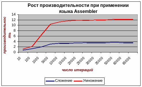При применении языка Assembler рост производительности наблюдается от 10 итераций до 25000 и дальше стремиться к постоянному значению равному ~3,7. Даже такое увеличение производительности заметно скажется на работе некоторых приложений, использующих большие вычисления.