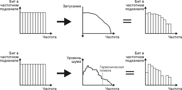 При использовании DMT количество бит данных, передаваемых по каждому подканалу может варьироваться в зависимости от уровня сигнала и шума в данном подканале. Это не только позволяет максимизировать производительность для каждой конкретной абонентской линии, но также позволяет уменьшить влияние таких эффектов как переходные помехи или RFI (смотри рисунок 18). Количество бит данных, передаваемых по каждому подканалу определяется на фазе инициализации. В общем случае использование более высоких частот вызывает более сильное затухание, что приводит к необходимости использования КAM более низкой разрядности. С другой стороны, затухание на низких частотах будет ниже, что позволяет использовать КAM более высокой разрядности. В дополнении к этому, распределение количества бит по подканалам может адаптироваться на фазе передачи данных, в зависимости от качества канала.