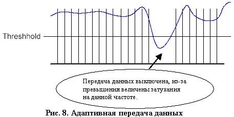 В технологии Powerline предусмотрен специальный метод решения этой проблемы -- динамическое выключение и включение передачи сигнала (dynamically turning off and on data-carrying signals). Суть данного метода заключается в том, что устройство осуществляет постоянный мониторинг канала передачи с целью выявления участка спектра с превышением определенного порогового значения затухания. В случае обнаружения данного факта использование этих частот на время прекращается до восстановления нормального значения затухания (рис.8).