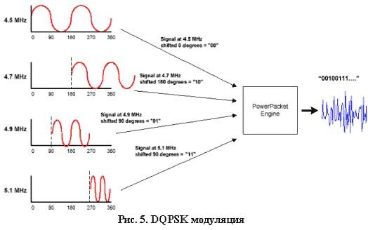 После этого все они проходят через PowerPacket engine и собираются в единый информационный пакет, который еще называют OFDM-symbol. На рисунке 5 приведен пример относительной квадратурной фазовой манипуляции (DQPSK - Differential Quadrature Phase Shift Keying) на каждой из 4-х поднесущих частот в диапазоне 4-5 МГц.