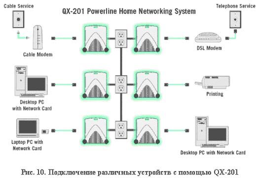 Расстояние между отдельными точками небольшое, несколько десятков метров. Как видно из рисунка, объединение пользователей в доме можно осуществлять через сеть электропитания, а в качестве доступа к магистральной сети использовать один или несколько модемов (кабельных или DSL).