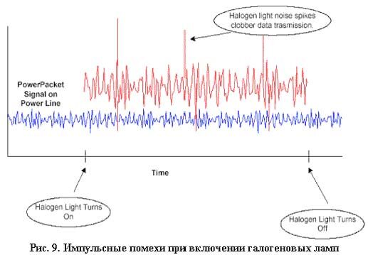 Другой серьезной проблемой при передаче данных по бытовой электросети являются импульсные помехи (до 1 микросекунды), источниками которых могут быть галогеновые лампы (ри.9), включение и выключение различных электроприборов и т.д.