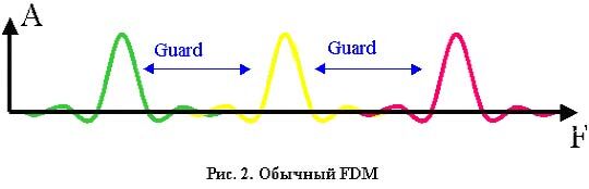 При использовании обычного частотного мультиплексирования (FDM - Frequency-Division Multiplexing) защитные интервалы (Guard Band) между поднесущими, необходимые для предотвращения взаимного влияния сигналов, довольно велики (рис.2), поэтому доступный спектр используется не очень эффективно.