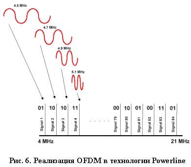 Реально в технологии Powerline используются 84 поднесущие частоты в диапазоне 4-21 МГц (рис.6).