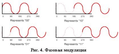 Перед тем как отдельные поднесущие частоты будут объединены в один сигнал, они претерпевают фазовую модуляцию (рис.4), каждая -- своей последовательностью бит.