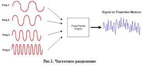 Основой технологии Powerline является использование частотного разделения сигнала, при котором высокоскоростной поток данных разбивается на несколько относительно низкоскоростных потоков, каждый из которых передается на отдельной поднесущей частоте с последующим их объединением в один сигнал (рис.1).