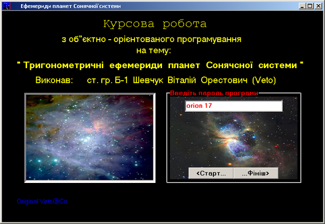 обчислення руху планет Сонячної системи. Програма розбита на кілька структурниx частин : Form1 ’Ефемериди планет Сонячної системи’, Form2 ‘Обчислення ефемерид планет Сонячної системи’, Form3 ‘Огляд зоряного неба’, Form4 ‘Детальний огляд зоряного неба’.