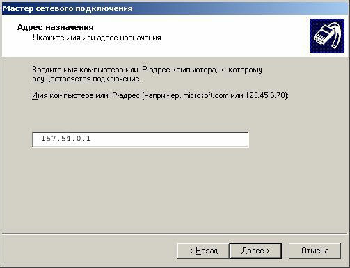 В следующем окне в текстовое поле нужно ввести IP-адрес сери VPN например 157.54.0.1 и нажать кнопку Далее как показано ниже: