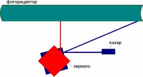 Лучи синего и красного цвета соответствуют различным положениям зеркала. В момент А зеркало повернуто под одним углом (красное положение зеркала). В следующий момент времени, соответствующий частоте лазера зеркало поворачивается и занимает синее положение. Отраженный луч попадает уже в другую точку фоторецептора. Естественно в реальности существуют еще дополнительные зеркала, призмы и световоды отвечающие за фокусировку и изменение направления луча.