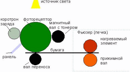 Лазерный принтер как уже говорилось действует по тому же принципу, но в качестве источника света используется лазер, который меняет потенциал в определенных участках фоторецептора, на которые затем переносится тонер. При этом используется следующий механизм.