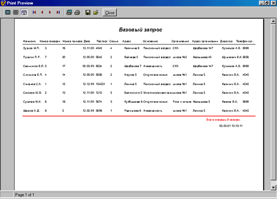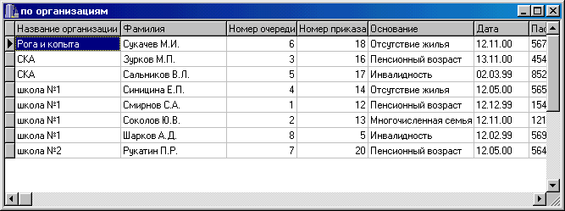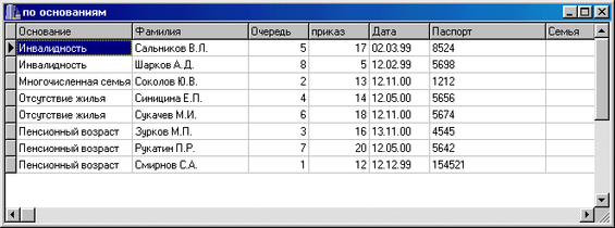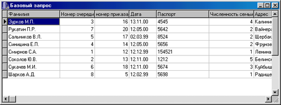 Фамилия, номер очереди, номер приказа, код организации, код основания, дата , номер паспорта, численность семьи, адрес.