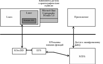 EFS реализована в виде драйвера устройства, работающего в режиме ядра и тесно связанного с драйвером файловой системы NTFS. Всякий раз, когда NTFS встречает зашифрованный файл, она вызывает функции из драйвера EFS, зарегистрированные им в NTFS при инициализации EFS. Функции EFS осуществляют шифрование и расшифровку файловых данных по мере обращения приложений к шифрованным файлам. Хотя EFS хранит FEK вместе с данными файла, FEK шифруется с помощью открытого ключа индивидуального пользователя. Для шифрования или расшифровки файловых данных EFS должна расшифровать FEK файла, обращаясь к криптографическим сервисам пользовательского режима.