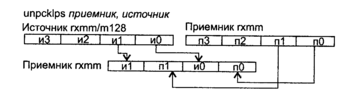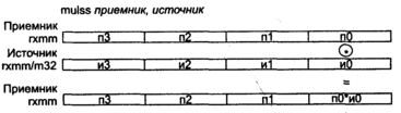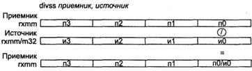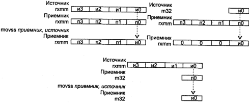 Значение источника может быть расположено в 32-битной ячейке памяти или младшем двойном слове регистра ХММ. Значение приемника расположено в младшем двойном слове другого регистра ХММ.