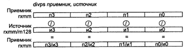 DIVPS (DIVide Packed Single-precision float-point) — деление упакованных значений в формате ХММ согласно следующей схеме.