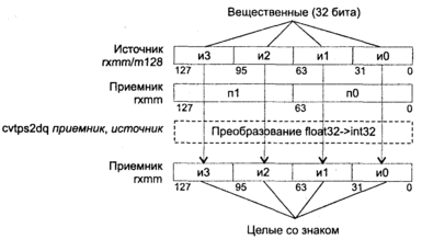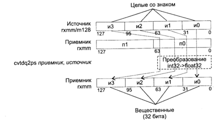 CVTDQ2PS (ConVerT Packed Doubleword integers to Packed Single-precision floatingpoint values) — преобразование четырех упакованных 32-битных целых со знаком в четыре упакованных значения с плавающей точкой одинарной точности.