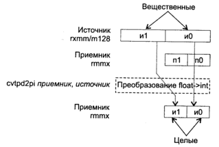 CVTPD2PI (ConVerT Packed Double-precision floating-point values to Packed doubleword Integers) — преобразование двух упакованных значений с плавающей точкой двойной точности в два упакованных 32-битных целых.
