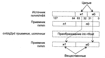 CVTDQ2PD (ConVerT packed Doubleword Integers to Packed Double-precision floating-point values) — преобразование двух упакованных 32-битных целых в два упакованных значения с плавающей точкой двойной точности.