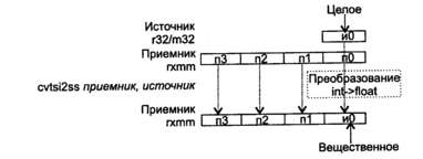 CVTSI2SS (ConVerT Scalar signed Int32 to Scalar Single-precision float-point) -скалярное преобразование знакового 32-битного целого в вещественное значение.