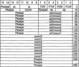 FXRSTOR (ReSTORe Fp and mmX state and streaming simd extension state) — восстановление без проверки наличия незамаскированных исключений с плавающей точкой состояния сопроцессора, целочисленного и потокового MMX-расширений из 512-байтной области памяти (см. рисунок ниже).