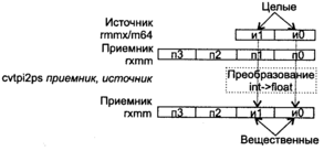 CVTPI2PS (Conversion Two Packed signed Int32 to Packed Single-precision float-point) — преобразование двух упакованных 32-битных целых в два упакованных вещественных значения.