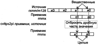 CVTPS2PI (ConVersion Two Packed Single-precision float-point to Packed signed Int32) — преобразование двух вещественных целых в два упакованных 32-битных целых.