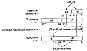 CVTPI2PD (ConVerT Packed doubleword Integers to Packed Double-precision floating-point values) — преобразование двух упакованных 32-битных целых в два упакованных значения с плавающей точкой двойной точности.