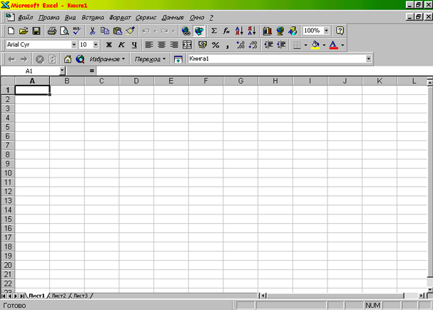 Окно Excel содержит множество различных элементов (см рис.1). Некоторые из них присущи всем программам в среде Windows, остальные имеются только в этом табличном редакторе. Вся рабочая область окна Excel занята чистым рабочим листом (или таблицей), разделённым на отдельные ячейки. Столбцы озаглавлены буквами, строки - цифрами.