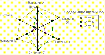 На этой диаграмме ряд данных, охватывающий наибольшую часть площади (сорт A), представляет сорт с самым высоким содержанием витаминов.