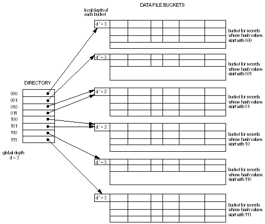 Вместо бинарного дерева расширяемое хеширование предусматривает список, элементы которого ссылаются на блоки. Сами же элементы адресуются по некоторому количеству i битов псевдоключа (см. рис). При поиске берется i битов псевдоключа и через список (directory) находится адрес искомого блока. Добавление элементов производится сложнее. Сначала выполняется процедура, аналогичная поиску. Если блок неполон, добавляется запись в него и в базу данных. Если блок заполнен, он разбивается на два, записи перераспределяются по описанному выше алгоритму. В этом случае возможно увеличение числа бит, необходимых для адресации. В этом случае размер списка удваивается и каждому вновь созданному элементу присваивается указатель, который содержит его родитель. Таким образом, возможна ситуация, когда несколько элементов показывают на один и тот же блок. Следует заметить, что за одну операцию вставки пересчитываются значения не более, чем одного блока. Удаление производится по такому же алгоритму, только наоборот. Блоки, соответственно, могут быть склеены, а список – уменьшен в два раза.